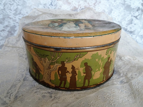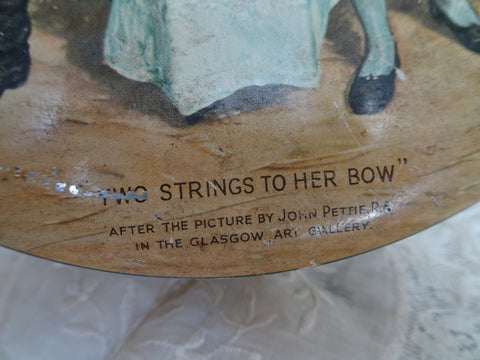 GORGEOUS round tin with an illustration on the lid showing a Regency lady with two escorts, labelled 'Two Strings to her Bow' after the picture by John Pettie, RA in the Glasgow Art Gallery. The sides show silhouettes of ladies and gentlemen against a background of green trees.