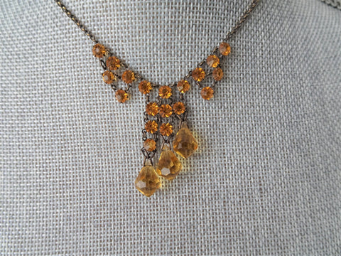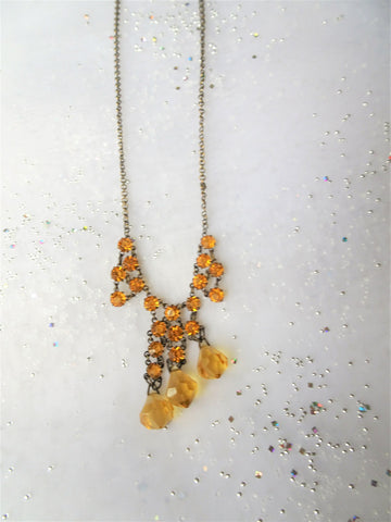 STUNNING and Unique Art Deco vintage glass necklace! Unique design with 3 faceted glass drops, brilliant crystal glass in a lovely golden glass color, very different and eye catching design. The necklace is signed Czechoslovakia on the clasp. It measures about 15.75 inches and the lowest drop is 1.5 inches.