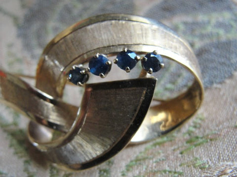 40s RETRO 14 KT Gold Figural Brooch Textured Ribbon With Blue SAPPHIRES Pin Broach Fine Estate Jewelry