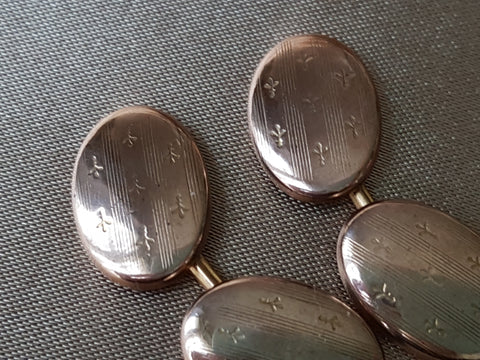 The cuff links have wonderful fleur dis Lis on a striped engraved background which is most attractive. They are marked "Rolled Gold".