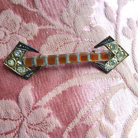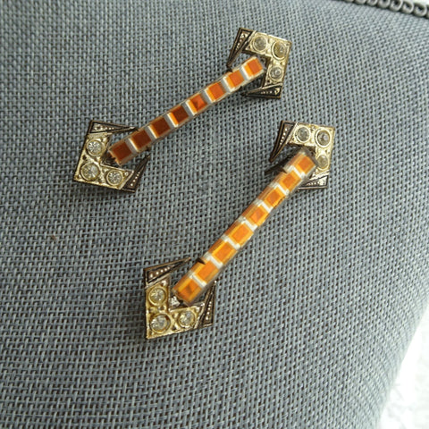 Interesting Deco arrow design pins that have cut glass with peach coloring and embossed silvered metal-very unique! Perfect as dress clips, brooches or hat pins. Each arrow brooch measures about 2.75 inches in length, slight loss of silver finish but in a pleasant manner, otherwise wonderful.