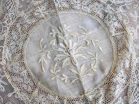 Absolutely beautiful antique French Normandy lace pillowcase, with superb hand done whitework embroidery on handkerchief linen and tambour work on net lace, all hand pieced together with different French laces.