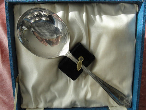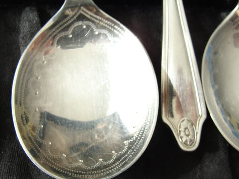Elegant 1920s silver plate dessert spoons and serving spoon in lovely box.