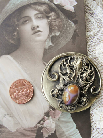 Beautiful very large Victorian button that measures an amazing TWO inches, detailed filigree Art Nouveau work with art glass stone.