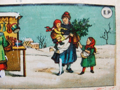 This is a cheery glass slide with typical Victorian Christmas scene , dates from the late 1800's. There is a lovely old St Nick Santa Claus in yellow pants and long blue robe!