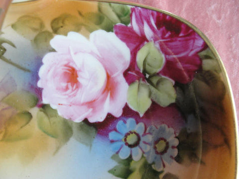 This basket like design has the most lovely hand painted PINK ROSES flowers, with the wide handle being lush gold.