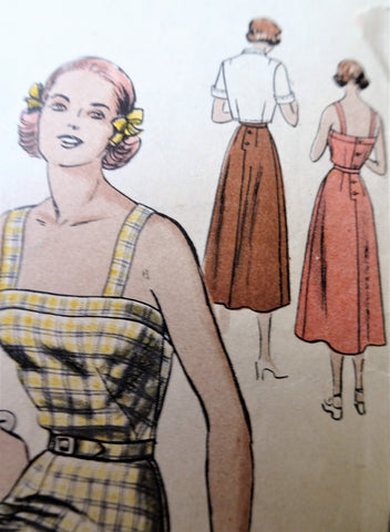 Vogue 6467; ca. 1949; One-piece dress and bolero. Four-piece flared skirt joins sleeveless bodice at waist-line. Low camisole top. Fitted bolero with cutaway fronts below shaped collar. Short sleeves with cuffs.