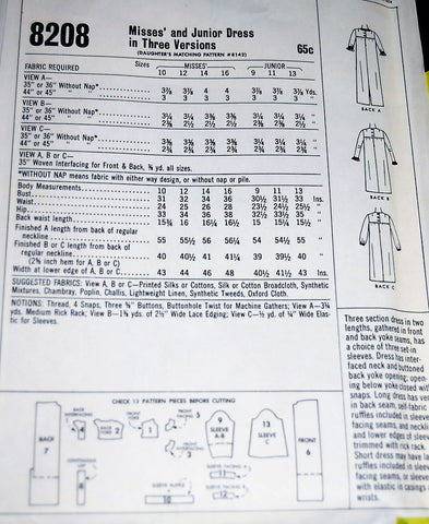 McCall's 8208; ©1966; Misses' and Junior Dress in Three Versions. "Easy To Sew" . Three section dress in two lengths, gathered in front and back yoke seams, has a choice of three set-in sleeves. Dress has interfaced neck and buttoned back yoke opening; opening below yoke closed with snaps. Long dress has vent in back seam, self-fabric ruffles included in sleeve facing seams, and neckline and lower edges of sleeves trimmed with rick rack. Short dress may have lace ruffles included in sleeve facing seams, or sleeves with elastic in casings at wrists.