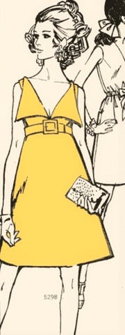 Butterick 5298; ca. 1969; Misses' One-Piece Evening Dress. High-waisted sleeveless dress has low V- neckline with fold-over self or contrast front collar. Self belt.