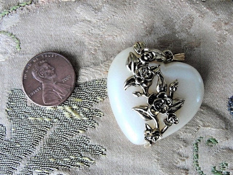 ANTIQUE Heart Pendant, Puffy Lustrous Pearl Like ,Intricate Raised Gold Metal Roses, Perfect Bridal Necklace,Collectible Vintage Jewelry