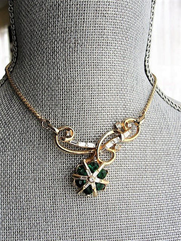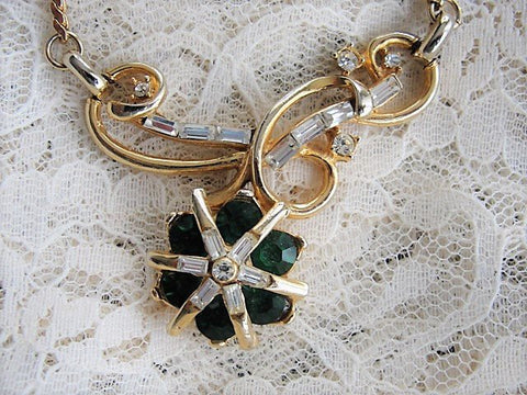 BEAUTIFUL 1950s Emerald Green Rhinestones Necklace, Unique Design, Gold Tone Metal Necklace,Elegant Evening Necklace,Bridal Jewelry