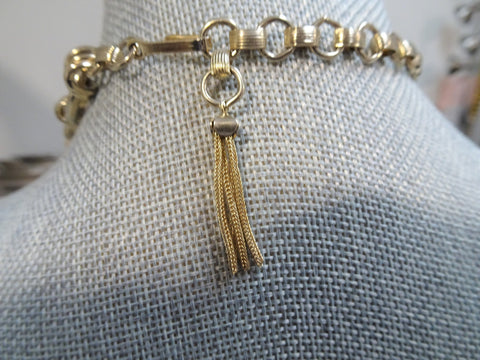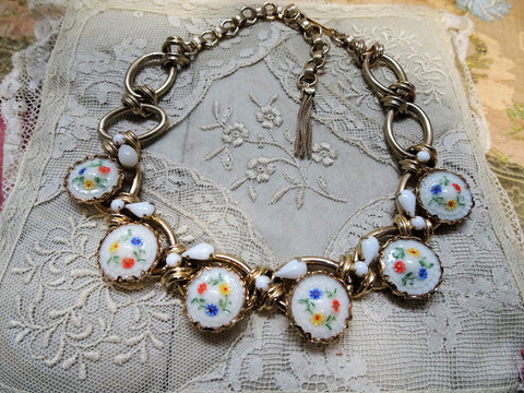 This is a lovely gold tone metal necklace with gorgeous milky white art glass ,with painted flowers, just lovely! The necklace measures about 16 inches in length. In wonderful condition, ready to be worn and enjoyed.