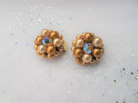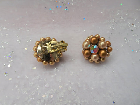 LOVELY 50s Earrings, Bronze Pearls and AB Crystal Rhinestones Earrings,Mid Century Clip On Earrings, Ear Clips,Vintage Collectible Jewelry