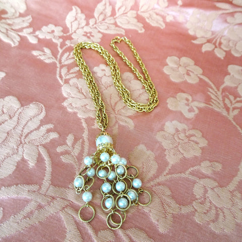 LOVELY Tassel Pendant Necklace, Unique Design, Gold Tone Metal and Faux Pearls, Mid Century Design, Collectible Vintage Jewelry