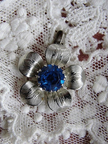 Fabulous vintage small flower design pendant set with pretty sapphire blue stone and textured silver tone metal. The lovely pendant measures 2 inches not counting the bale, in wonderful gift giving condition.