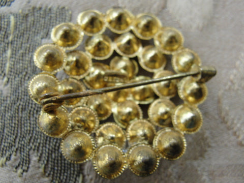 Dazzling vintage 1930s Czech signed round brooch with sparkling green emerald stones set in goldtone metal.