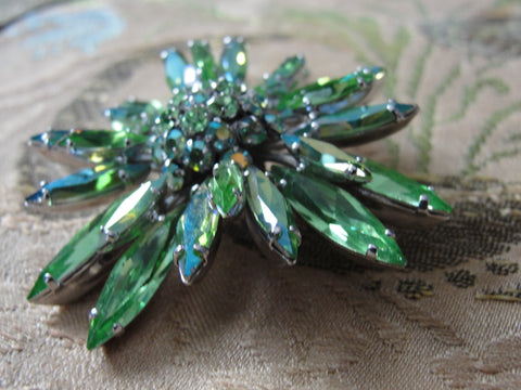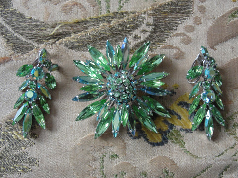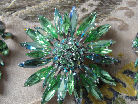 Glittering periodot green aurora borealis stones in a fabulous design both brooch and matching earrings an assortment of stones including sparkling marquise navettes and round stones which flash a stunning turquoise blue and gold colors depending on the light.