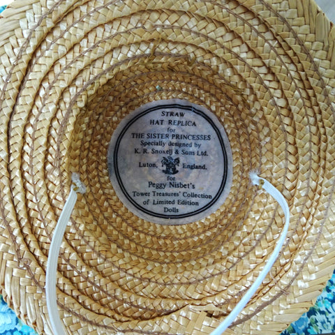 This lovely doll wears a pretty smocked dress with large back bow and puffed sleeves from Liberty's of London printed floral fabric. She wears a replica hat made of beautifully woven straw by the world famous hat maker's K.R. Snoxell and Sons of Luton England, a company that specialises in the manufacture of straw boaters, as worn by Eton scholars. The sweet little hat is adorned with pretty flowers. She stands about 15 inches high. The wig was specially made to represent the hairstyle of the young Princess.