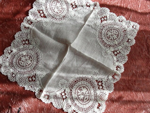 It measures 11 inches by 11 inches, fine linen center, in wonderful vintage condition.