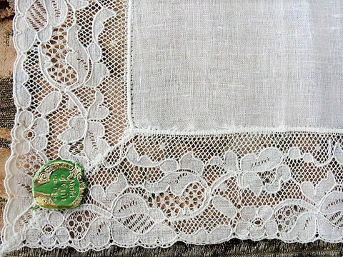 This fine hankie has exquisite, intricate and beautiful vintage French lace. It measures about 12 inches by 11 inches, fine Irish linen center , in wonderful condition-never used still with its original label.