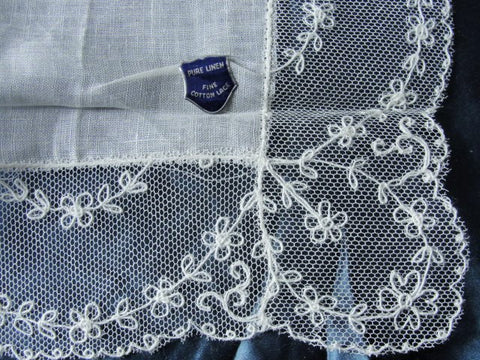 hankie has exquisite, intricate and beautiful lace. It measures about 10 inches by 10 inches, fine Irish linen center still with original label, in wonderful never used condition.