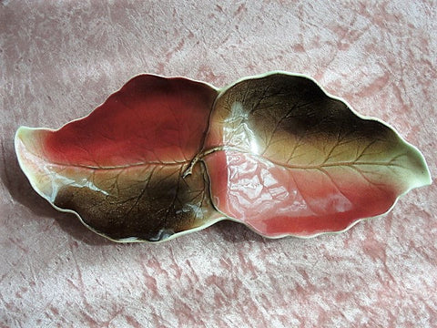 Attractive and decorative long leaves serving dish in gorgeous autumn colors of browns and wines, with a glass like glaze-really lovely dish!