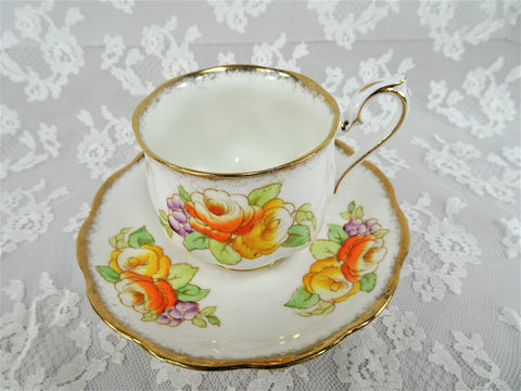 This is a lovely set that is colorful with abundant gold trim, lovely cheerful colors of sunny yellow, orange and purple and green-very pretty! The cup and saucer is in wonderful condition, looks like it just sat in a china cabinet.