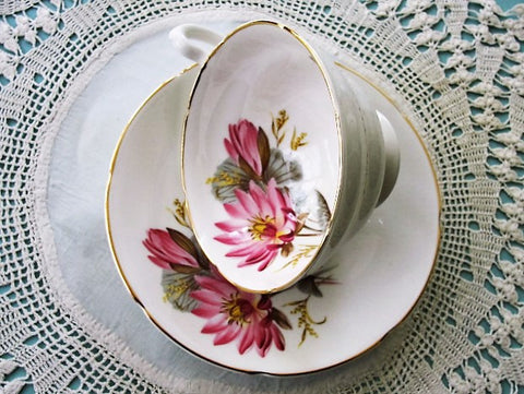 This Beautiful teacup and saucer set has lush pink Flowers- so romantic! By English bone china maker Royal Grafton . The set is in fine condition ready to use or give as a gift.  The perfect touch to any little girl tea, shower, luncheon, as a hostess or bridesmaid gift , tea Party or just for everyday fun! A most beautiful vintage teacup and saucer to add to your collection of fine china, enjoy using it for a special tea time or party. Fun to use for bridal showers luncheons !