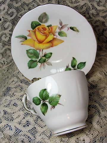 This Beautiful vintage teacup and saucer set has lush yellow Rose Flowers- so romantic! The pattern is MINERVE By English bone china maker Adderley . The set is in fine condition ready to use or give as a gift.