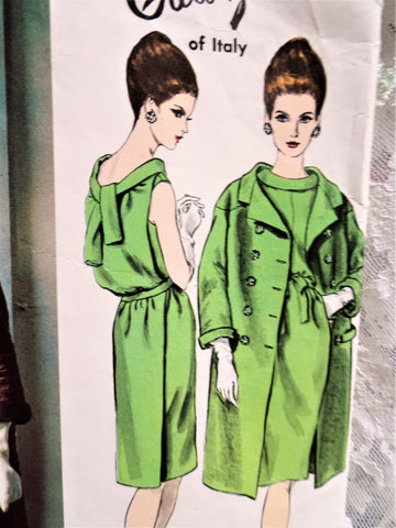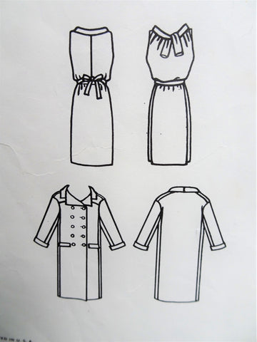 Vogue Couturier Design 1438; ca. 1965; Galitzine - One-Piece Evening Dress and Coat. Narrow, sleeveless dress with slightly bloused bodice. Loose panel at back. Waistline lifted at center front. The bias-fold-collar loops over in tie-ends at center back. Boxy, double-breasted coat has saddle shoulder yoke extending into dropped armholes. Wide-away notched collar and narrow cuffed, bracelet length sleeves. Flap pockets.