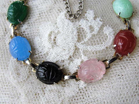 Vintage Scarab Costume Fashion Jewelry inspired by King Tut's tomb. Lovely domed and carved Glass Scarab Stones which are prong- set in a silver tone metal with safety catch.
