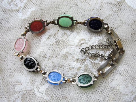 BEAUTIFUL King Tut Glass Bracelet,Scarab Fashion,Glass Scarab Stones Bracelet,Silver Tone Metal,Hieroglyphics,Archaeological Style Jewelry