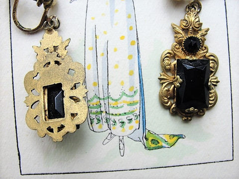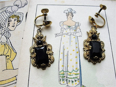 Beautiful vintage cut glass French Jet drop earrings, most likely Czech made from the 1920s. These are truly lovely being 1.5 inches in length. Beautifully faceted black glass set in gilt brass. A most lovely pair of earrings to enjoy wearing and adding to your collection of fine vintage costume jewelry. We combine shipping and ship World Wide!