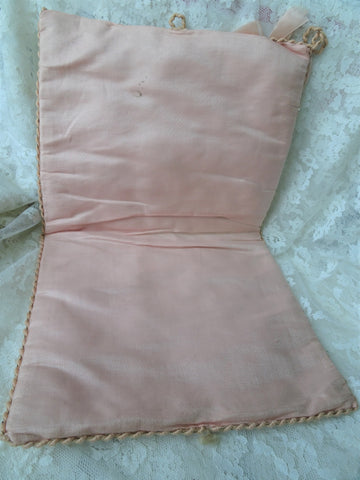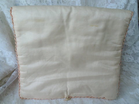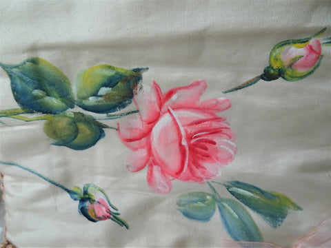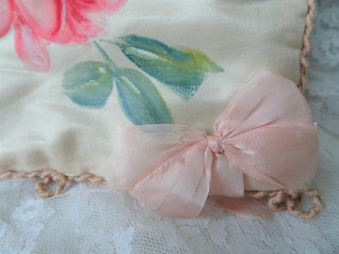 Beautiful French pink silk Handkerchief holder with sweet hand painted PINK roses. The Hankie fold is in wonderful condition for it's age, shows age with a few age spots,as expected still displays beautifully. Lovely hand painted boudoir case. This hanky holder has the most beautiful hand painted roses!