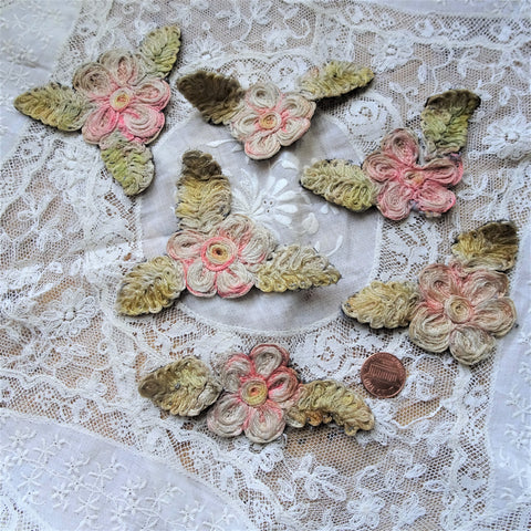 CHARMING vintage French hand embroidered antique Edwardian applique rose flower. The gorgeous applique is made of beautiful shaded colors of pinks, cream, soft golden yellow and moss green. Just such lovely soft antique colors truly unique and special!