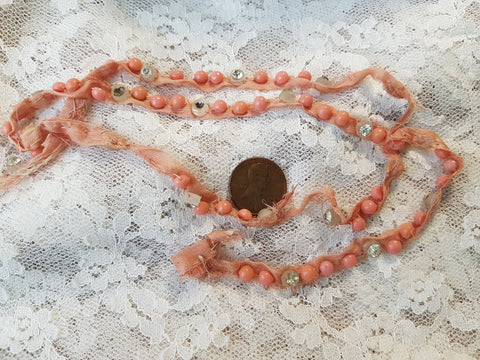 Victorian Dress Trim, French Rose Pink Glass and Frosted Glass on Pink Silk, Perfect Tiny Size For Doll Costuming, Fine Heirloom Sewing