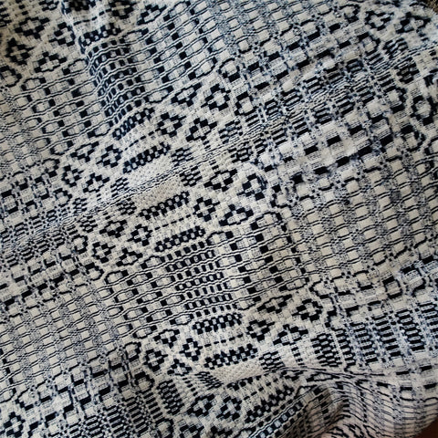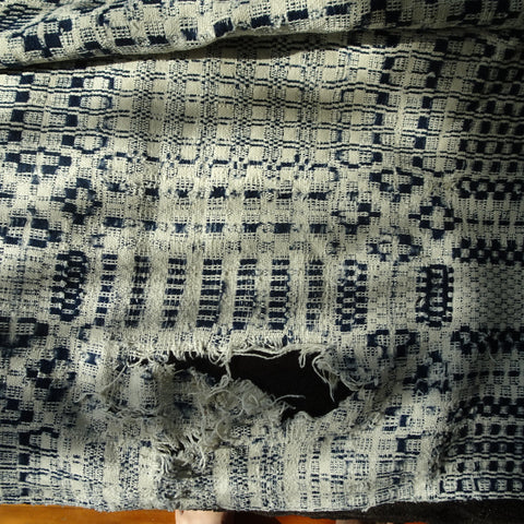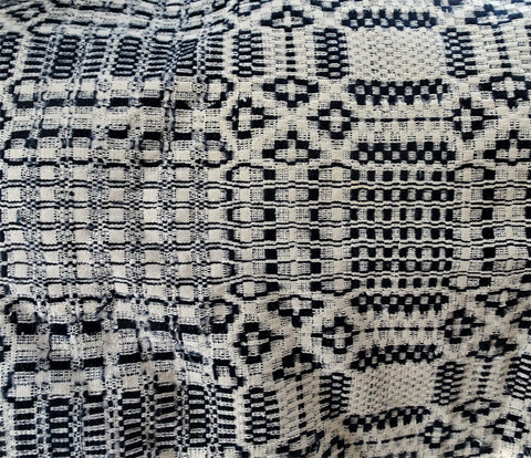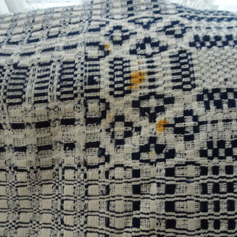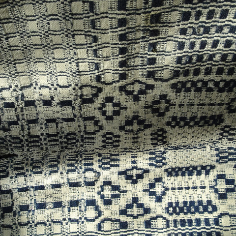ANTIQUE Woven Coverlet, Blue Cream,Country,Log Cabin, FarmHouse, Americana Decor, Hand Made Antique Textile, Rustic Primitive Decorative