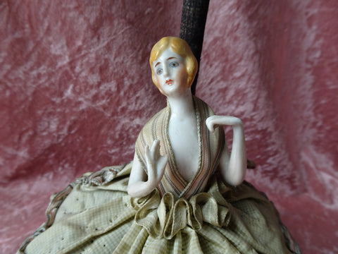 BEAUTIFUL Art Deco hat pin and hat stand! Charming 1920s porcelain half doll with arms away and legs dressed in her original dress. The hat stand also acts as a pincushion for your hatpins! The doll is probably made in Germany and is in wonderful condition.