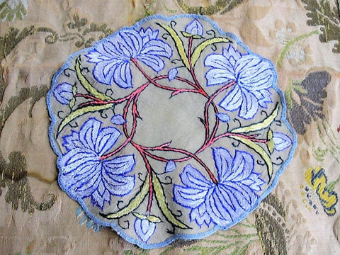 This is an exceptionally beautiful hand embroidered silk flowing flowers on natural silk. The doily or small centerpiece measures about 8 inches across, in wonderful condition.
