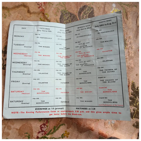 This is a small programme commencing Tuesday July 8th 1941 , listing all the wonderful Gilbert and Sullivan operas.