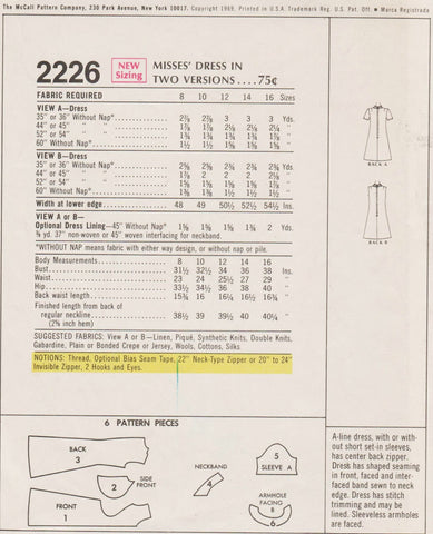 McCall's 2226; ©1969; Misses' Dress in Two Versions. A-line dress, with or without short set-in sleeves, has center back zipper. Dress has shaped seaming in front, faced and interfaced band sewn to neck edge. Dress has stitch trimming and may be lined. Sleeveless armholes are faced.