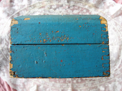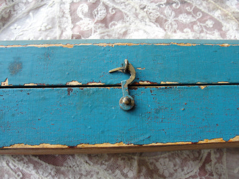 This is a charmer with that perfect aged French Blue paint! The box still has its brass higes and hook closure. It measures about 10.5 inches by a tad over 4 inches and stands about 2.75 inches high.