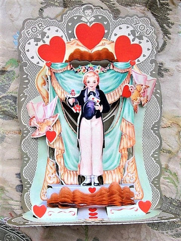 Beautiful stand up foldout large antique Valentine! The stand up Valentine has a sweet boy and doves and has honeycomb decoration.