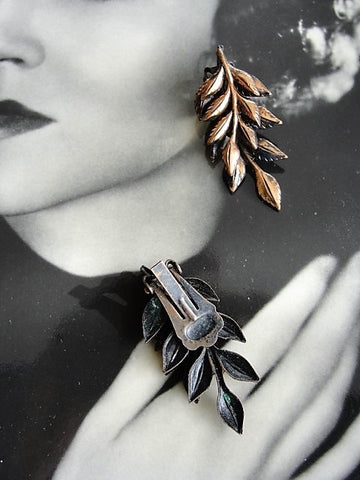 Beautiful Vintage clip on earrings made of copper from the 1950s. These clip ons are intricate design being 2 layers of leaves, very similar to Renoir Matisse 'Laurel'.