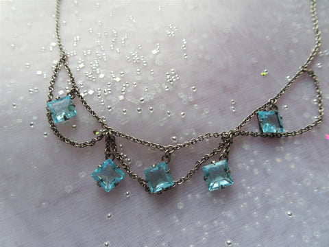 GORGEOUS 1920s Art Deco aquamarine blue color crystal necklace set in silver tone metal.