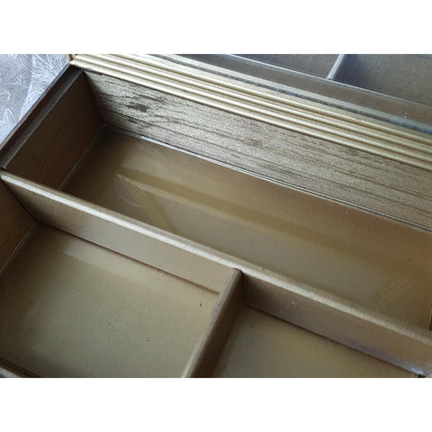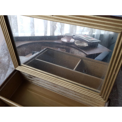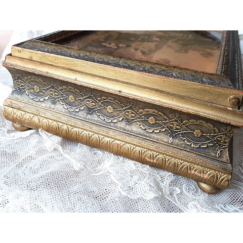 The box has a time aged gilt finish, some decorative damage on the front but fine elsewhere but still displays beautifully. The box is hinged and has a lot of decorative charm!