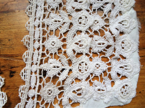 This 1920s-30s lace collar was saved from a dress a long time ago, it has lovely openwork lace . Perfect to reuse on a sweater or dress, or use in fine heirloom sewing project.