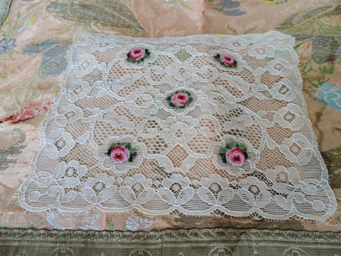 Antique French  lace centerpiece,doily or vanity tray cloth with gorgeous roses embroidery work.