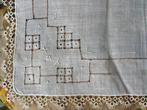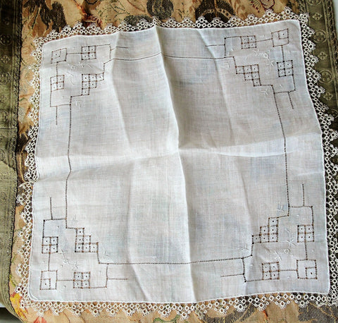 The lace is exquisite and the linen is fine. It is in like new condition, measuring about 12 inches by 12 inches.