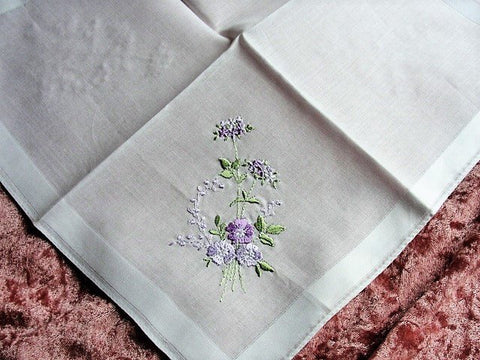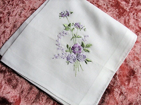 LOVELY VINTAGE HANKIE,Handkerchief,Delicate,Dainty Lilac Pansies Hand Embroidered Hanky,Sweet Raised Pansy Flowers,Something Old Bridal Gift